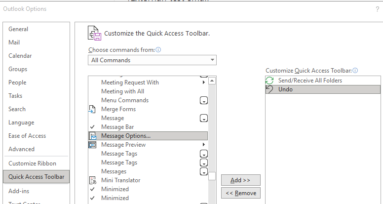 choose All Commands in “choose commands from” under customize toolbar –> select message options –> add –> OK